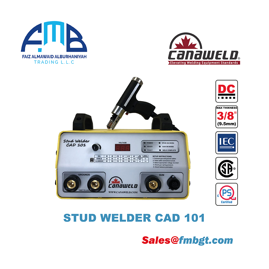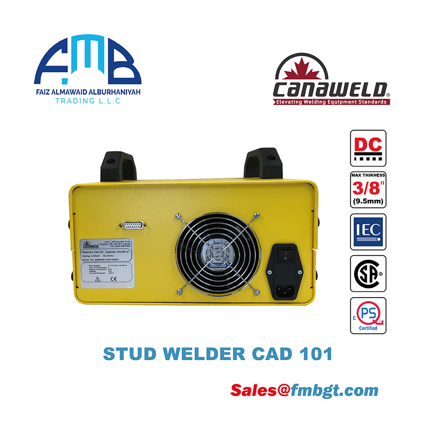 The Canaweld CAD 101 stud welding system offers a full 3/8” (M10) welding capacity and has the industry’s best capacitance-to-weight ratio. Because of the CAD 101’s compact design, it is suitable for benchtop or automated applications with the Canaweld auto feed welding head, and can be used with any of Canaweld’s hand guns. The CAD 101 is equipped with a microcontroller which will keep this model continually up to date. It is equipped with a 15-pin subminiature interface allowing for remote triggering, ready signals, and reload circuitry among others for automation. The CAD 101 is sold as a stand-alone power supply or as a complete welding system including gun, two ground cables, and collets and changing tools.